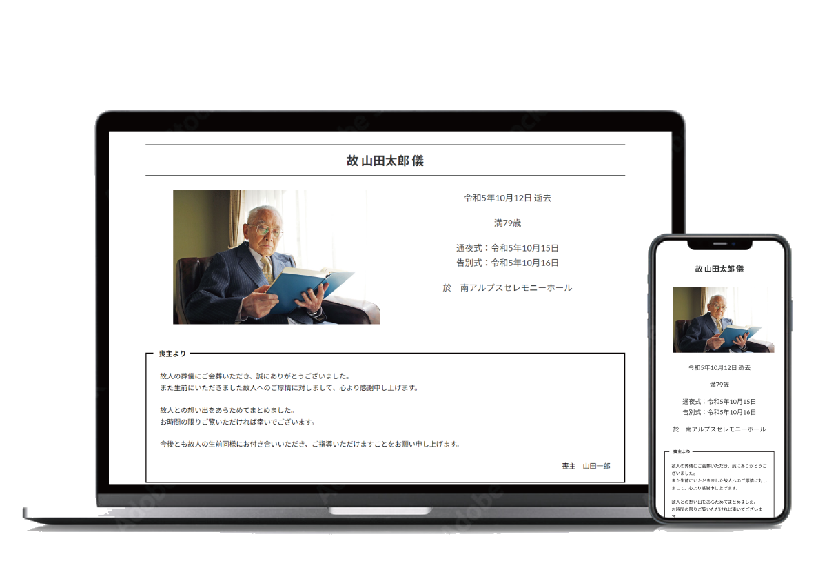 「メモリアルページ」は、葬儀に用意した写真や動画、葬儀までには用意できなかった故人との想い出の資料をホームページの様にまとめ、葬儀場に来れなかった方とも故人との想い出を共有できるサービスです。